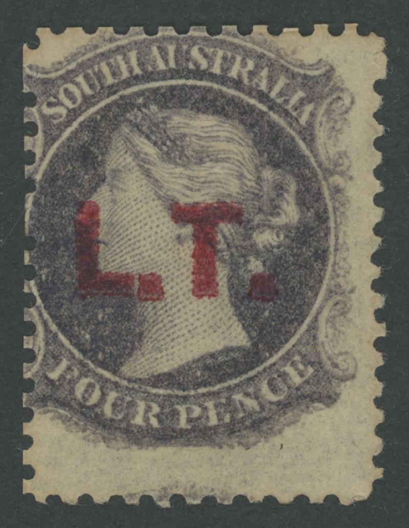 BLACK OVERPRINT: 'L.T.' on QV Perkins Bacon Large Star Wmk Perf 11½-12½ 4d deep purple SG DO318, unused, Cat £750. Rated RRRR. Superb. Ex Baron von Ferrary, Theodore Champion and Philip Croker. Chris Ceremuga Certificate (2009) states "extremely rare". Superior to the unused 'Besancon' example - trimmed perfs on two sides - that sold for SFr905. Absent from Don Pearce's collection. (Image1)