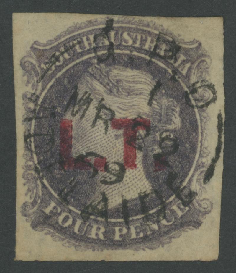 RED OVERPRINT: 'L.T.' on QV Perkins Bacon Large Star Wmk Rouletted 4d deep violet SG DO311b, rouletting at top & base and cut from the sheet well clear of the design at left & right, light GPO cds of 'MR22/69', Cat £2500. Unlisted rouletted by Ron Butler & the only recorded example so it should be rated RRRRRR. Superb. Sold at our auction of 16.5.2023 for $4075 (Sale 251 Lot 663). Absent from the 'Besancon' and Don Pearce collections. (Image1)
