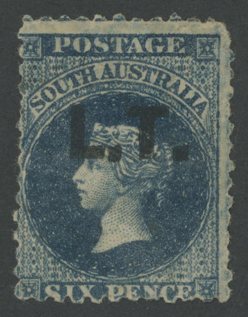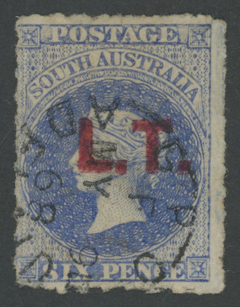 RED OVERPRINT: 'L.T ' (No Stop after 'T ') on QV Perkins Bacon Large Star Wmk Rouletted 6d ultramarine SG DO312a, rouletting on all sides, light GPO cds of 'DE11/68', Cat £200. Rated R. Superb. Ex 'Sir Humphrey' (Brian Farmer): sold for $111 (Sale 118 Lot 399). Don Pearce's larger example sold for $323 (Sale 247 Lot 418). [Date range 3.4.1868 to 20.3.1869] (Image1)
