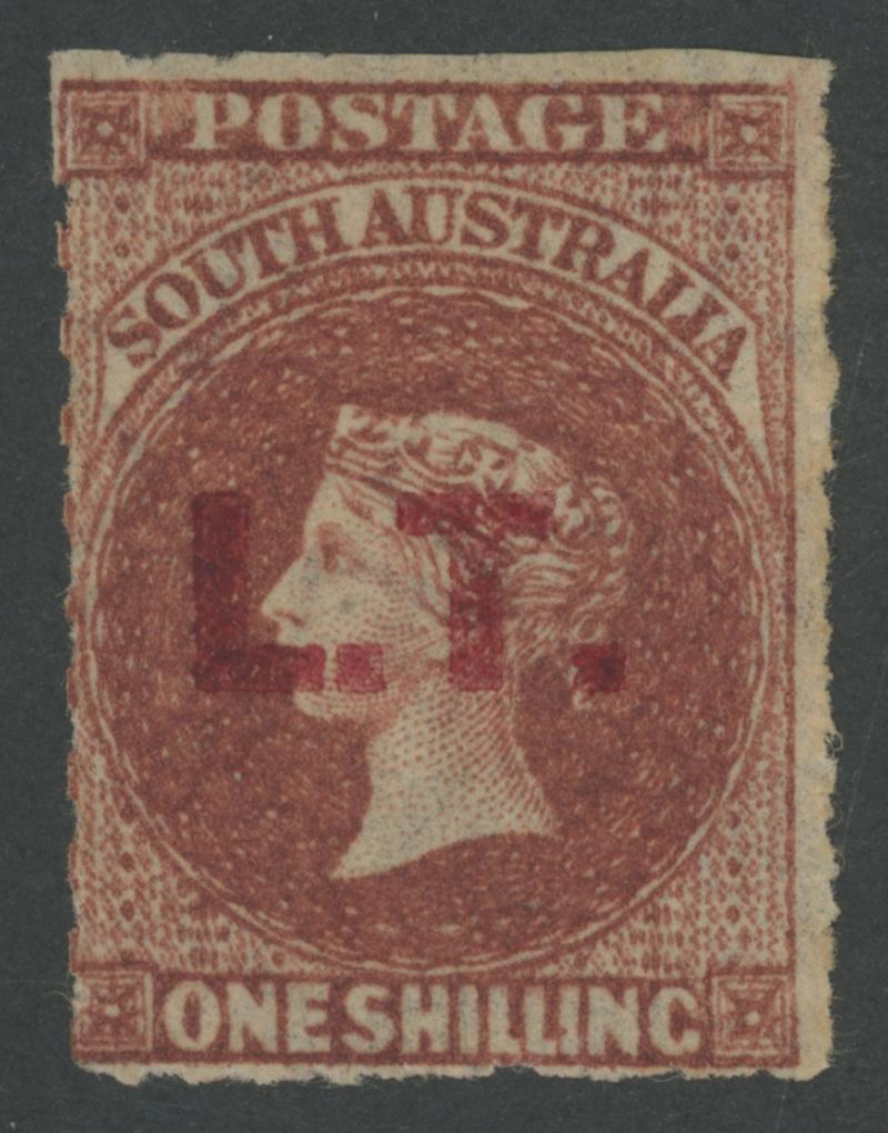 RED OVERPRINT: 'L.T.' on QV Perkins Bacon Large Star Wmk Rouletted 1/- bright red-brown SG DO313, rouletting on all sides clear of the design except at left, large-part gum, Cat £600. Rated RRR. Ex Rev James Mursell and Colonel Napier (II). The similar 'Besancon' example sold for SFr485. Absent from Don Pearce's collection. (Image1)