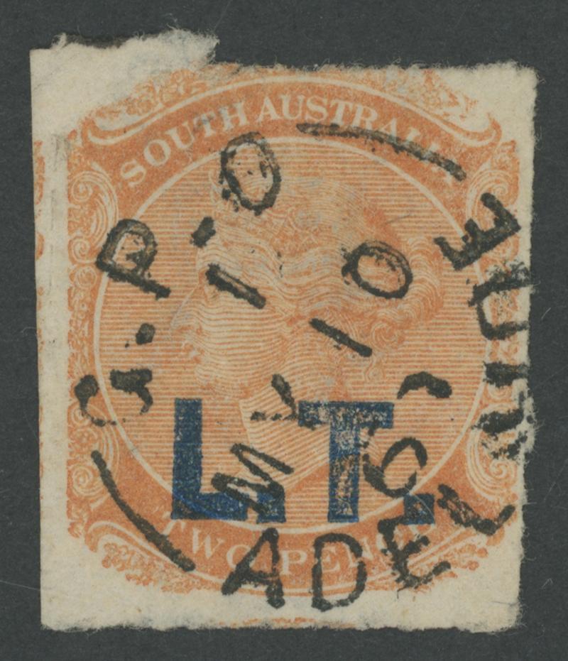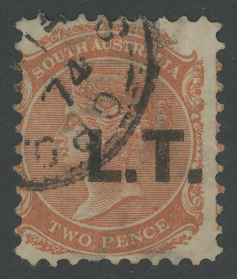 BLACK OVERPRINT: 'L.T.' on QV De La Rue Crown/SA Wmk Perf 10 2d brown-orange SG DO320 with the Watermark Reversed, one short perf at the base, part-GPO cds of 1874, Cat £250+. Rated RRRR+; unrecorded unused. Sold at our auction of 24.6.2006 (Sale 122 Lot 719). Chris Ceremuga Certificate (2019) states "rare". Superior to Don Pearce's example - a bit aged - that sold for $455 (Sale 247 Lot 424). [12.9.1874 is the only confirmed date] (Image1)