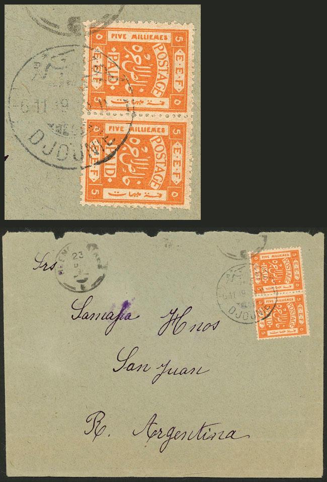 6/NO/1919 DJOUNIE to Argentina, cover franked with pair of Palestine stamps of 5m with datestamp of Djounie, arrival mark on front of Buenos Aires 23/DE and on back arrival of San Juan 25/DE, back flap is missing, very fine quality, rare! (Image)