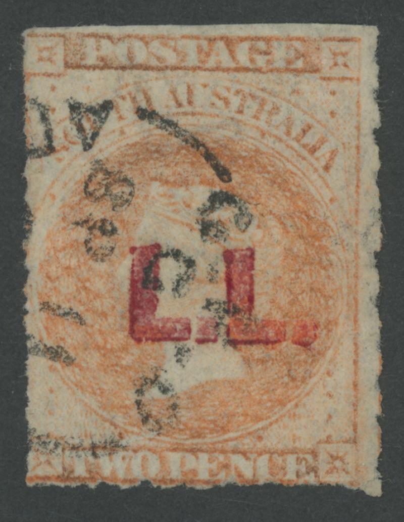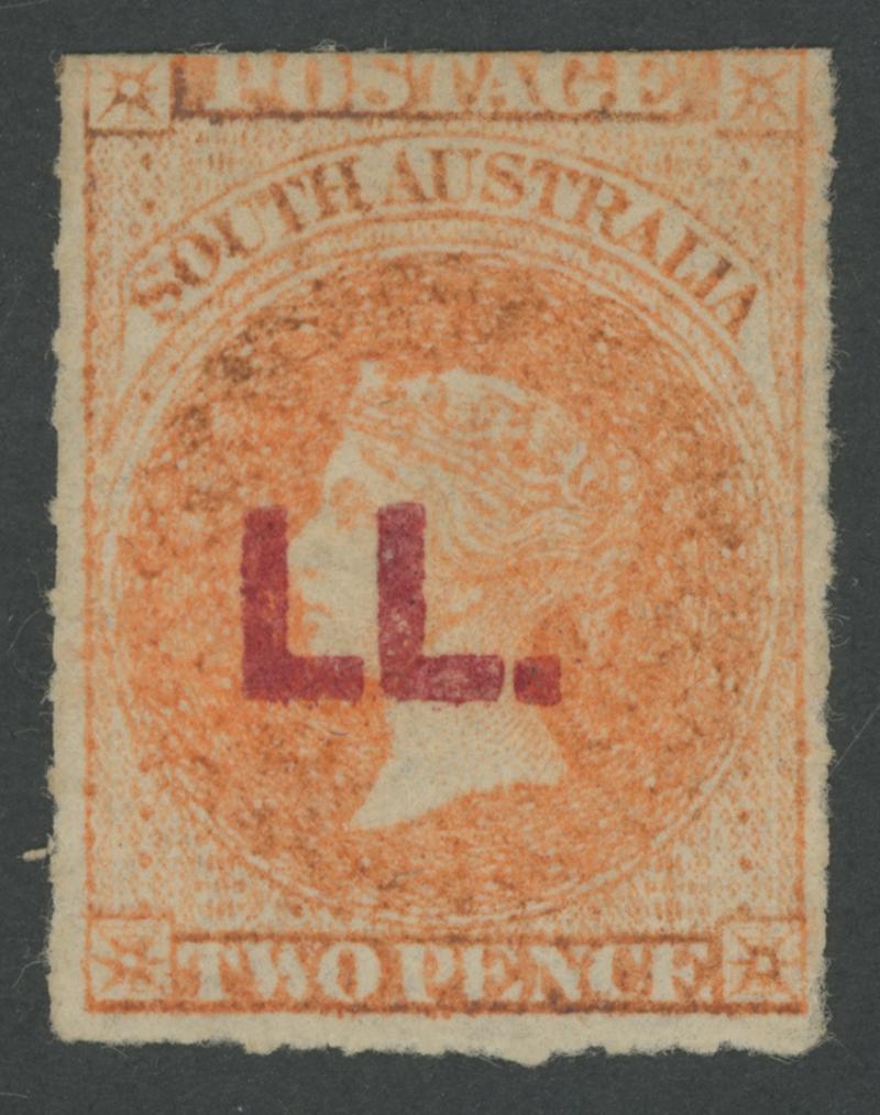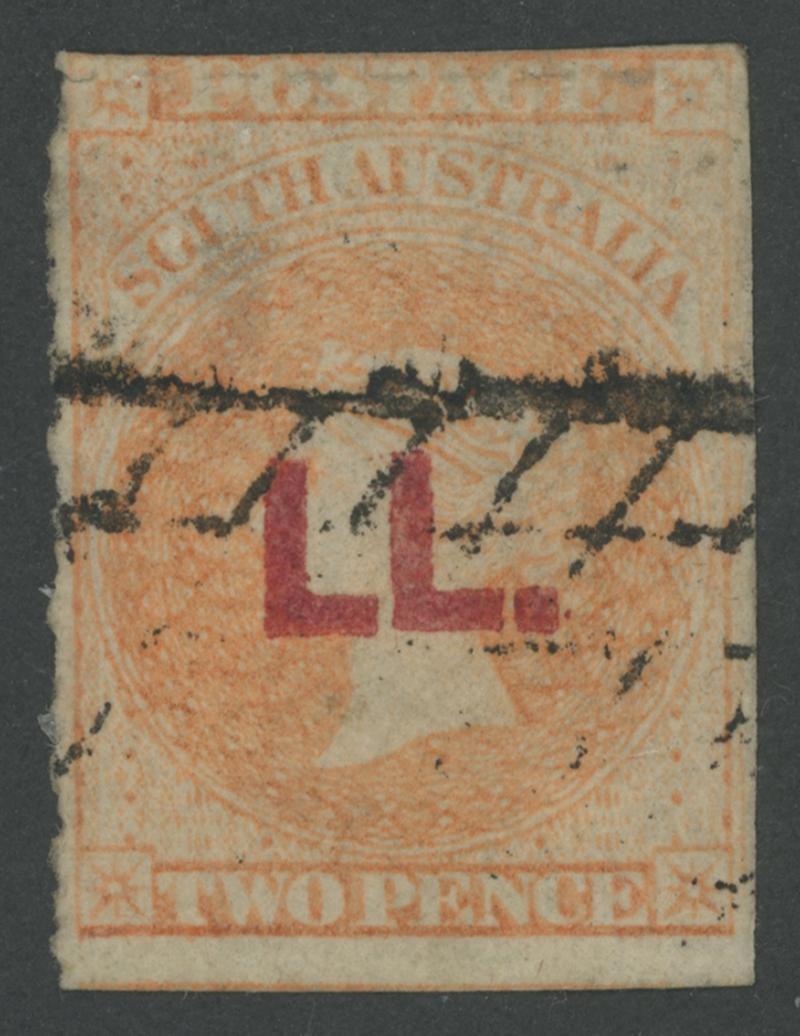 BLACK OVERPRINT: 'L.L.' on QV De La Rue Crown/SA Wmk Perf 10 2d deep orange-red SG DO310 with Defective Second 'L', GPO cds of AU25/77. Unlisted by Ron Butler & the only recorded example so, if genuine, it should be rated RRRRRR. Ex Don Pearce: sold for $204 (Sale 247 Lot 447). Offered 'as is'.