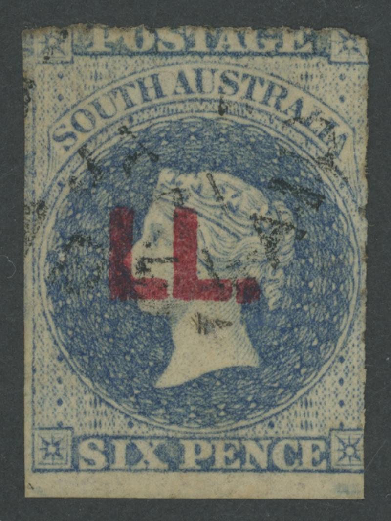 RED OVERPRINT: 'L.L.' on QV Perkins Bacon Large Star Wmk Rouletted 6d ultramarine SG DO306, rouletting except at top where cut from the sheet clear of the design, fine GPO cds of 'MR3/69', Cat £100. Rated R. The Don Pearce example - of the same date - sold for $174 (Sale 247 Lot 444). [Date range 3.3.1869 to 7.11.1873] (Image1)
