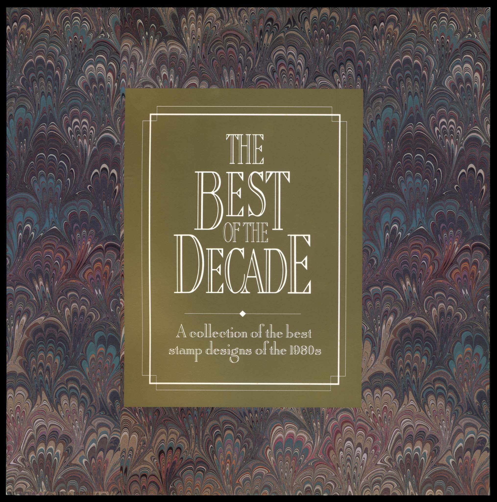 USPS soft bound book, "The Best of the Decade" - A Collection of the Best Stamp Designs of the 1980's, 53 page book, complete with stamps mounted; stamp face $12.70 and catalog value $31.45. The best of nos. 1827//2437 including balloons, cactus, space, reefs, horses, dogs, merry-go-round figures and more. Condition is excellent with tiny edge wear at lower right of cover. Great history of the design and production of these beautiful stamps. Packaging has very light foxing (Image)