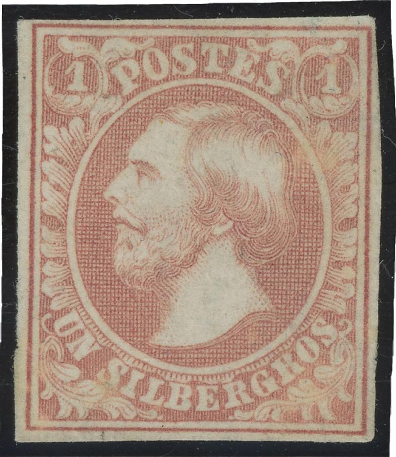 1852 Wilhelm III 1sgr carmine-rose Mi 2f (SG 3-5 group), margins good to large, unused, Cat €1600 (£2250). Superb. Lars Boettger Certificate (2019) states "einwandfrei" (= perfect!). (Image1)