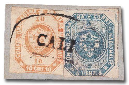 Colombia, 1859, Coat of Arms, 5c blue and 10c buff (Scott 2, 4a), tied on piece by Cali postmark, Fine. Scott $168. Estimate $50 - 75. Scott $168 Suggested Bid $50-75 (Image)