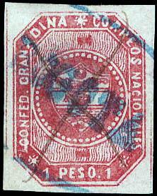 Colombia, 1859, Coat of Arms, 1p carmine (Scott 7), pen and BOGOTA cancels, Very Fine. Scott $120. Estimate $40 - 60. Scott $120 Suggested Bid $40-60 (Image)