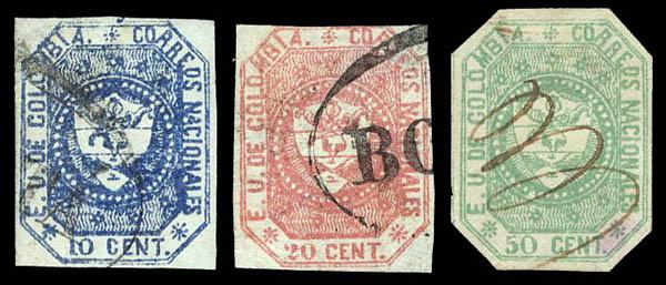 Colombia, 1862, Coat of Arms, 10c blue, 2c red and 50c green (Scott 19, 20, 21), group of 3, a lovely trio of stamps, Fine to Very Fine. Scott $1,010. Estimate $150 - 200. Scott $1,010 Suggested Bid $150-200 (Image)