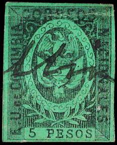 Colombia, 1862, Coat of Arms, 5p black on green (Scott 51), manuscript cancel, Fine to Very Fine. Scott $190. Estimate $60 - 80. Scott $190 Suggested Bid $60-80 (Image)