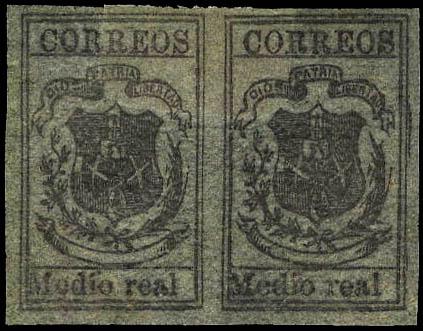 Dominican Republic, 1867, Coat of Arms, ½r black on greenish gray (Scott 16), horizontal pair, o.g., hinged, Very Fine. Scott $520. Estimate $150 - 200. Scott $520 Suggested Bid $150-200 (Image)