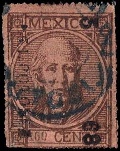 Mexico, 1868, Hidalgo (thin figures, perforated), 100c brown on brown (Scott 57), Fine to Very Fine. Scott $375. Estimate $120 - 180. Scott $375 Suggested Bid $120-180 (Image)