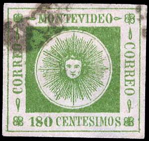 Uruguay, 1860, "Montevideo" and Sun, 180c yellow green, thick numerals (Scott 17), Very Fine. Scott $375. Estimate $120 - 180. Scott $375 Suggested Bid $120-180 (Image)