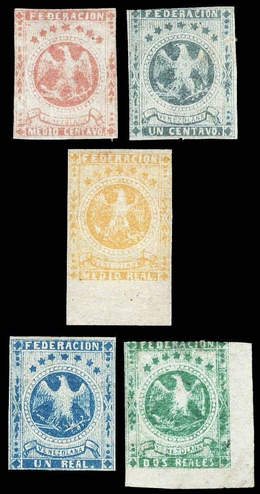 Venezuela, 1863, Eagle, ½c to 2r complete (Scott 10-14), set of 5, o.g., hinged, Fine to Very Fine. Scott $165. Estimate $50 - 75. Scott $165 Suggested Bid $50-75 (Image)