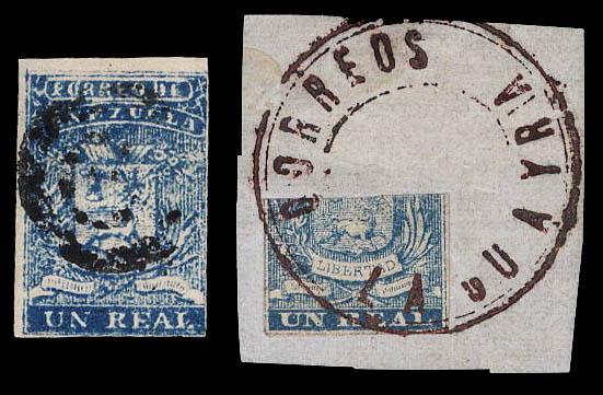 Venezuela, 1859, Coat of Arms (coarse impression), 1r blue, single + a bisect used on piece (Scott 5, 5c), Fine to Very Fine. The bisect on a full cover catalogs $7500. Estimate $75 - 100. Suggested Bid $75-100 (Image)