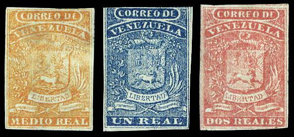 Venezuela, 1859, Coat of Arms, ½r to 2r complete (Scott 1-3), o.g., hinge remnants, Fine to Very Fine. Scott $553. Estimate $120 - 180. Scott $553 Suggested Bid $120-180 (Image)