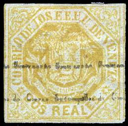 Venezuela, 1873, Coat of Arms, overprinted "Contraseña-Estampillas de Correo", 2r yellow (Scott 39), o.g., hinge remnant, Fine to Very Fine. Scott $300. Estimate $80 - 120. Scott $300 Suggested Bid $80-120 (Image)