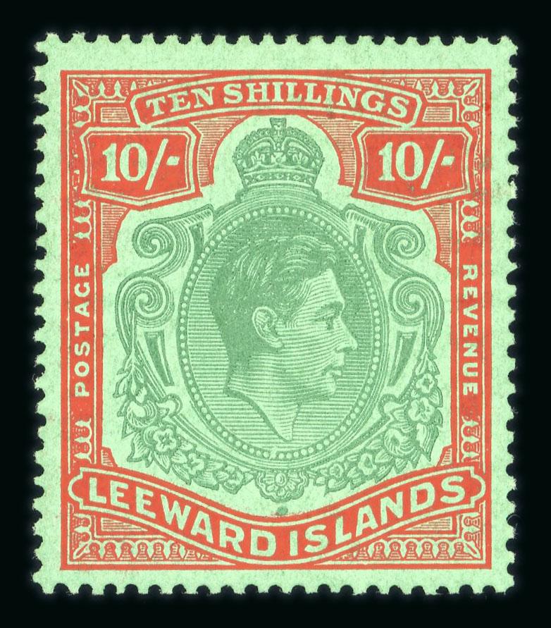 1938-51 10/- deep green and deep vermilion on green mint with the scarce 'Missing pearl' variety, large part o.g., very fine; cert. KGVI Expertising (S.G. £1'700). (Image)