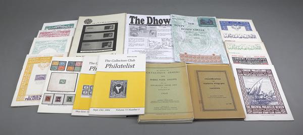 Egypt: Collection of Reference Titles, comprising Zéhéri Classification des timbres d'égypte et variétés (92 pp., library bound, 1922) and 1960 Catalogue des Timbres Poste d'Égypte (320 pp., paperback; loose), ten different issues of L'Orient Philatelique (1936//2002), Robson Lowe's Kings of Egypt and Their Stamps 1860-1960, May-June and Sept.-Oct. 1994 Collectors Club Philatelist, plus copies of The Egypt Study Circle Quarterly Circular, The Dhow, and The Arab World Philatelist, along with numerous other photocopies of articles, etc.; useful compendium. Shipping charges apply - weight 9.6 lbs. (Image)