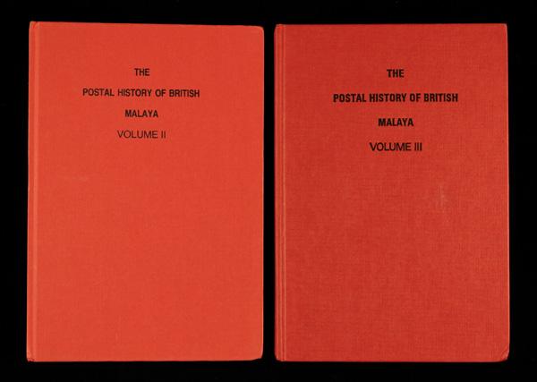 Proud, Edward B.,The Postal History of British Malaya, Vol. 2-3, 376, 365 pp., hardcover, 1982-84; Vol. 2 covers Federated Malay States, Vol. 3 discusses Unfederated Malay States; each fully illustrated with priced catalog of all known postal markings, including earliest and latest recorded dates, plus bibliography and index; indispensable books, first edition, now out of print, VF. Shipping charges apply - weight 3.9 lbs. (Image)
