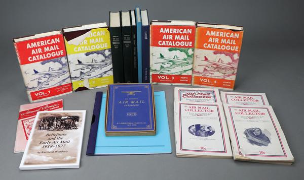 Various,All Things Aviation Library, US 24¢ Airmail Issue-1918, The Air Mail Collector (15 issues from Vol.1 No.1 1928-1930), History of Pioneer Air Mail Service 1910-1928 (O'Sullivan), Jenny! (Amick), Bellefonte and Early Air Mail 1918-1927 (Wunderly), The Historical Air Mail Catalogue 1929, AAMS 4th Ed Catalogue (4 volumes), and AAMS 5th Ed Catalogue (Vol 4, 5, and Supplement); good stuff, Fine to Very Fine, ex Neil. Shipping charges apply - weight 23 lbs. (Image)
