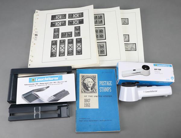 Stamp supplies, Lighthouse LU 150 LED 10x overlay magnifier (new in box), Lighthouse stamp mount cutter 180 (new in box), Postage Stamps of the United States 1847-1961 (issued by the Post Office Department), and SAFE hingeless pages, Germany 1955-1964, Fine. Shipping charges apply - weight 6 lbs. (Image)