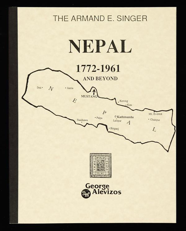 Singer, Armand E.,Nepal 1772-1961 and Beyond, 335 pp., tape-bound, 1997; photocopies (nine in color) of Singer's exhibit/collection, highly annotated, with Table of Contents and Index, creating a highly visual "mini-handbook," in which one not only reads about the material, but actually sees far more of it than in traditional treatments; topics range from Royal Seals and Official Mail, the British-Indian Post Office of Kathmandu, Anglo-Nepalese War, China Expeditionary Force, etc., etc., Native Issues of 1881-85, 1886-1930 classics, modern errors, and much, much more; a "must have" for anyone curious about the philately of this exotic land. Shipping charges apply - weight 2.1 lbs. (Image)