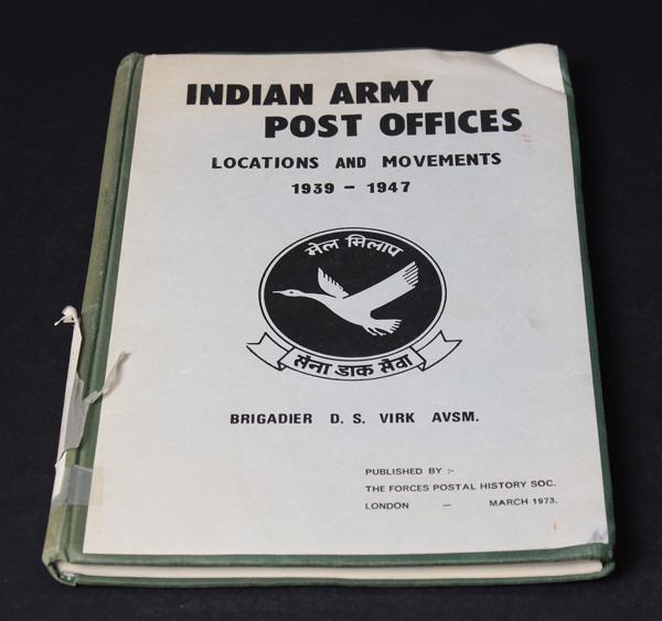 Virk, Brigadier D.S.,Indian Army Post Offices: Locations and Movements 1939-1947, 1973, 141 pages, hardcover; upper right corner crushed affecting covers and pages. Shipping charges apply - weight 1.6 lbs. (Image)