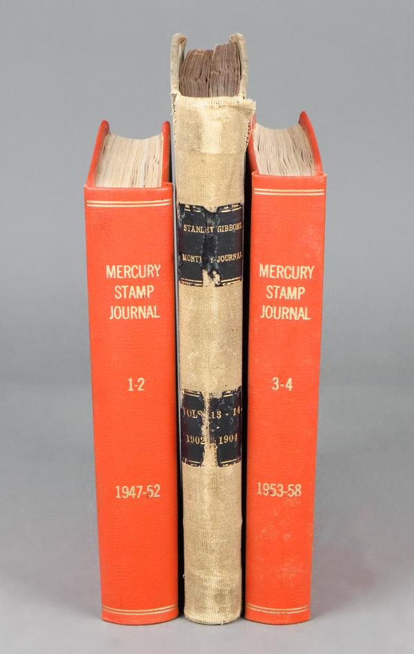 Stanley Gibbons and Mercury Stamp Company, bound volume of Stanley Gibbons Monthly Journal from 1902-1904 in fair condition; Mercury Stamp Journal 1947-1958 in two bound volumes in great shape; a super read. Shipping charges apply - weight 9 lbs. (Image)
