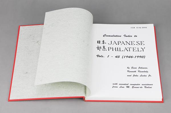 Johnson, Sue, Kenneth Kamholz, & John Ludes Jr. (eds.),Cumulative Index to Japanese Philately Vols 1-45 (1946-1990), 1991, 207 pages, hardcover. Shipping charges apply - weight 2 lbs. (Image)