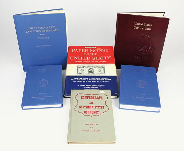 Reference Catalogs and Books, 1960-1990, Lot of 6 numismatic reference books including the 1976 edition of Grover C. Criswell's "Confederate and Southern States Currency"; the 1981, 10th issue of Freidberg's "Paper Money of the United States"; David W. Akers, 1975 edition of "U.S. Gold Patterns"; 1980 edition of M.H. Bolender, "The United States Early Silver Dollars', and 2 editions of the "American Journal of Numismatics", all are in new condition (6). Shipping charges apply - weight 11 lbs. (Image)