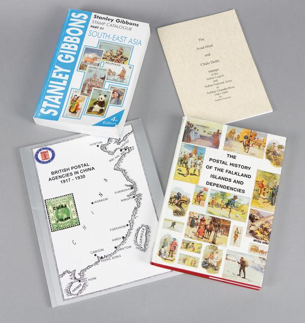Varied,Four titles for your philatelic library, Postal History of the Falkland Islands and Dependencies (2006 Proud), Stamps of Indian Legion (1999 Freeston), Part 21 South-East Asia (2004 Stanley Gibbons), and British Postal Agencies in China (2013 Zurich Asia auction catalog); useful lot, Fine to Very Fine. Shipping charges apply - weight 4 lbs. (Image)