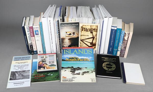 Pitcairn Islands philatelic and non-philatelic titles, 2 Bankers Boxes worth of philatelic and non-philatelic titles about the Pitcairn Islands; Pitcairn Island the Bounty Mutineers and Their Descendants, Islands in History and Representation, Awake Bold Bligh! Mutiny and the Romance in the South Seas, Bounty Trilogy, The Bounty's Boy, Miscellany of Pitcairn's Island, Pitcairn Islands Philately (2), Serpent in Paradise, Guide to Pitcairn, Bonhams 1996 auction catalog, Mutiny on the Bounty, Pitcairn Port of Call, Cassique of Kiawah, about 80 issues of Pitcairn Log, Pitcairn Islands Specialized Stamp Catalog (2), Pitcairn Islands Postal Markings 1883-2008, Pitcairn Islands Printed Cachets, and many others; bonus 6 hand painted leaves; fascinating. Shipping charges apply - weight 60 lbs. (Image)