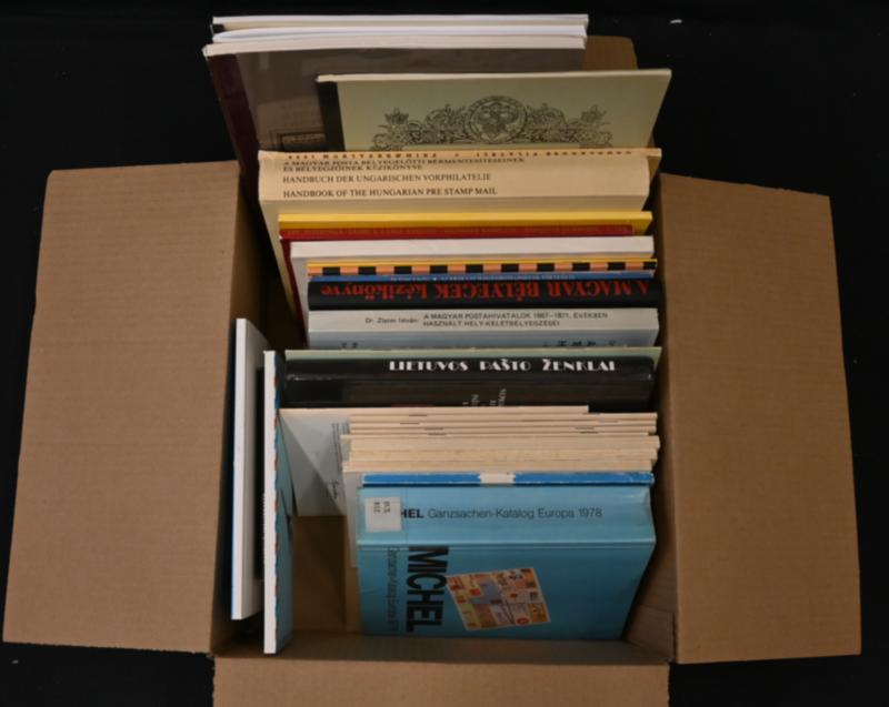 Philatelic literature in over 16 KG box, eg. Kauppi's issue 1930 handbook, tax rate book of Mattila, Lape catalogues, postmark handbooks and other basic books of the hobby (Image)