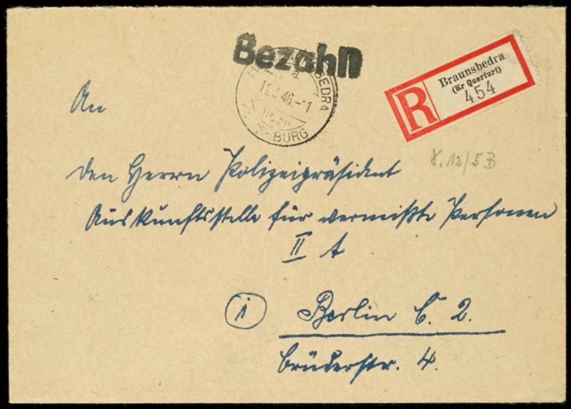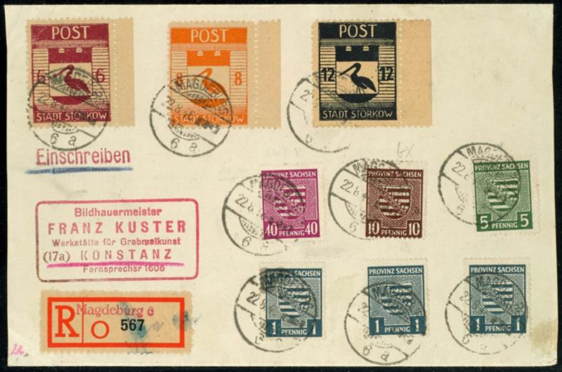 6 penny, 8 penny and 12 penny municipal coat of arms in mixed franking with numerals issue country Saxony as properly franking on registered letter from Magdeburg 22.8.46 to Constance with arrival postmark on the back from 31.8.46, expertized Stroh BPP (12/14,SBZ78bX) (Image 1)(Image)