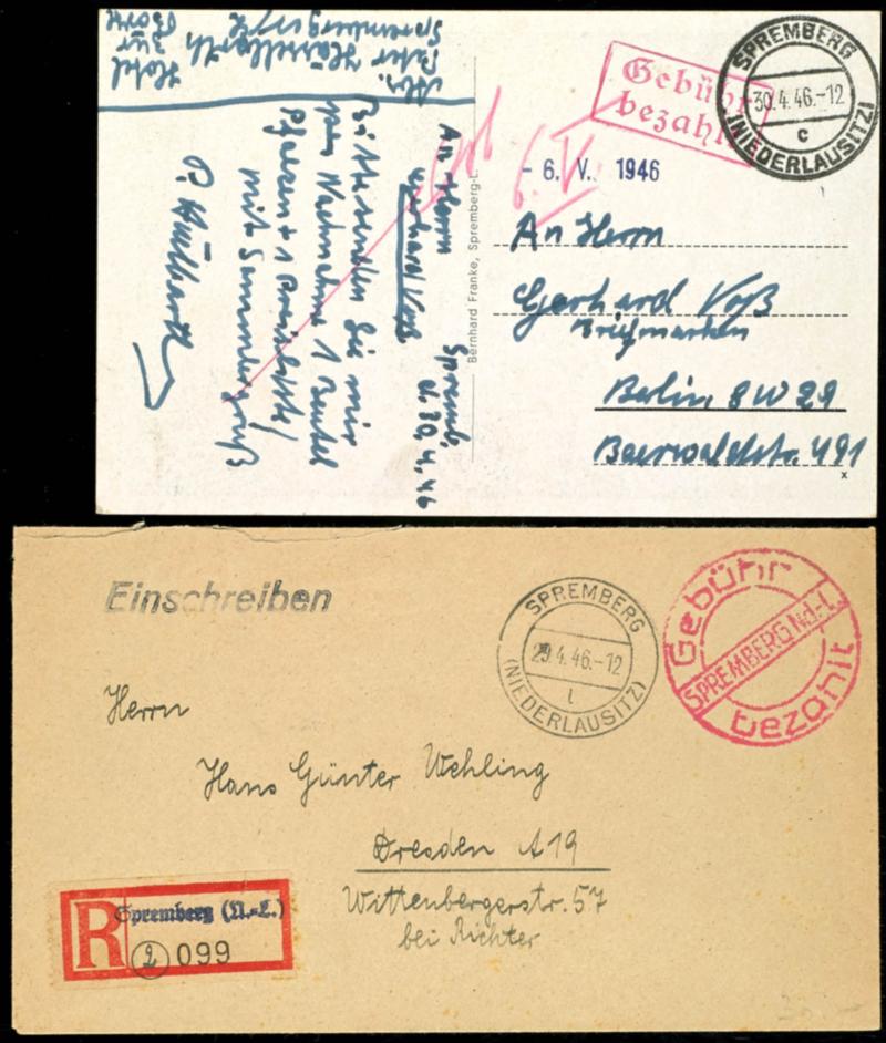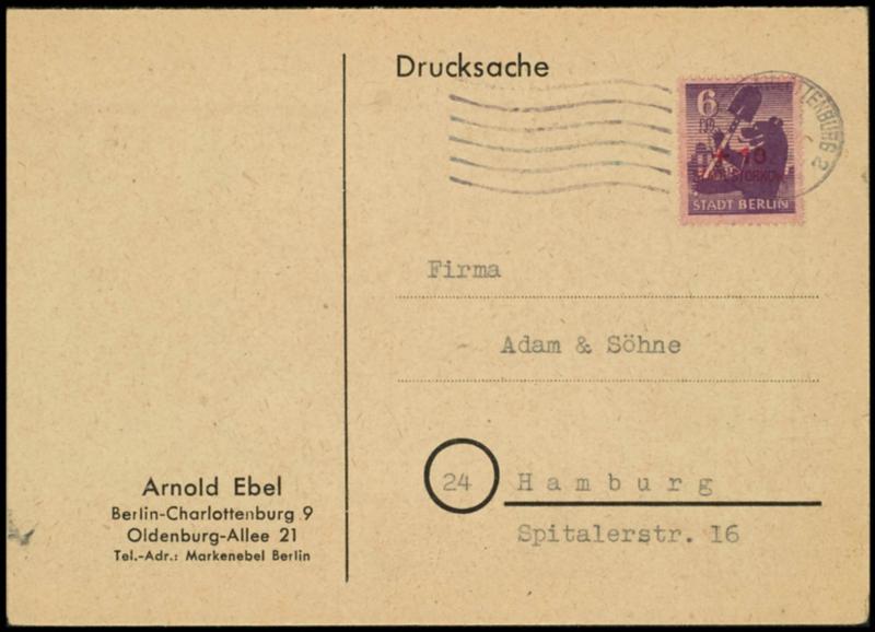 6 penny reconstruction with local overprint, properly franked single franking on companies legitimate postcard from 4.6.46 as West Berlin-use, in fact rare. (3) (Image 1)(Image)
