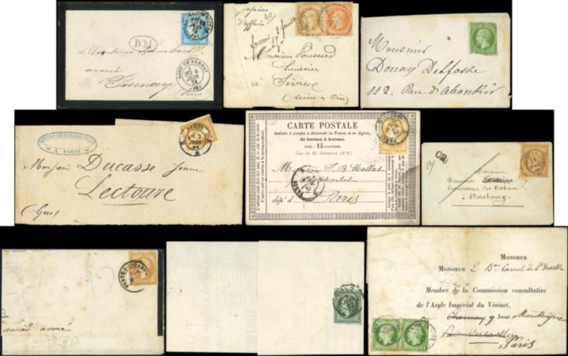 Empire Lauré, 8 Lettres affrts divers, destinations, taxée, port frontalier, toutes TB/TTB (Image)