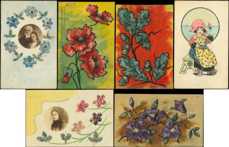 18 Cartes Postales décorées avec des découpes de timbres, principalement Sage et Semeuse, très joli lot (Image)