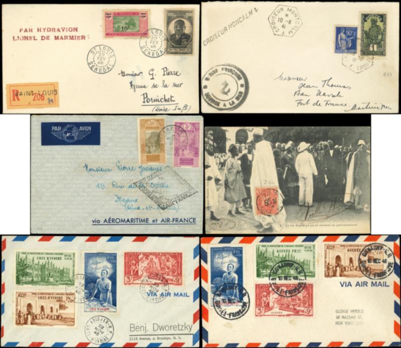 Lot de 23 Lettres ou documents, affranchissements et oblitérations divers des pays de l'A.O.F., 1905-53, lot varié, TB (Image)