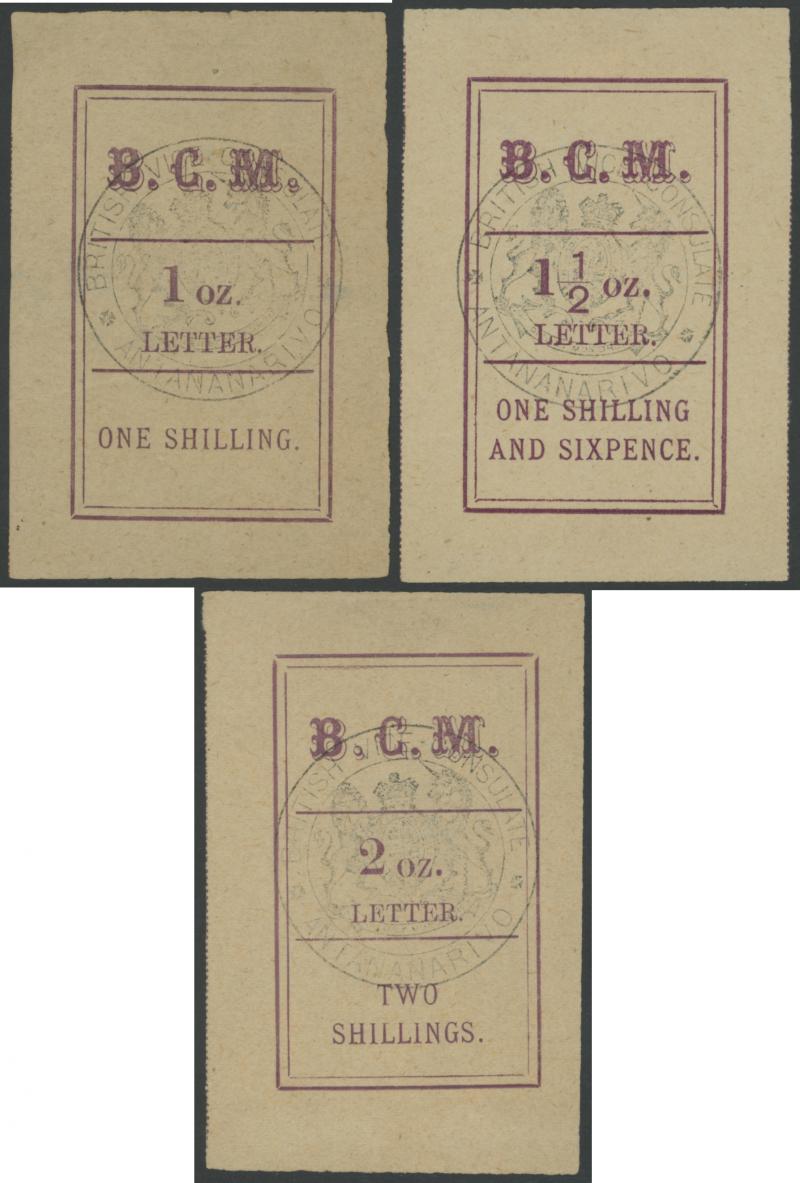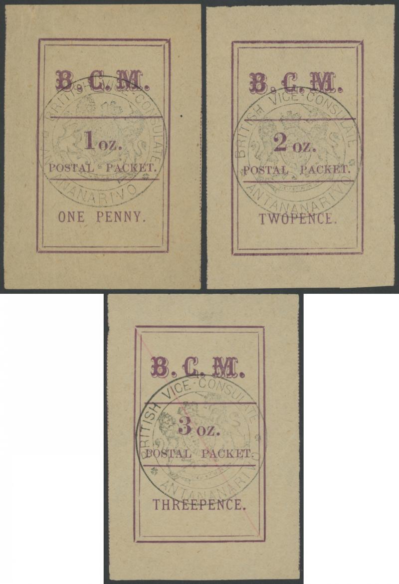 1884 British Mission at Antananarivo 'POSTAL PACKET' 1d (1oz) to 3d (3oz) SG 5-7, huge margins, the last CTO with diagonal red-ink line, the others unused without gum as issued, Cat £1375. (3) (Image1)