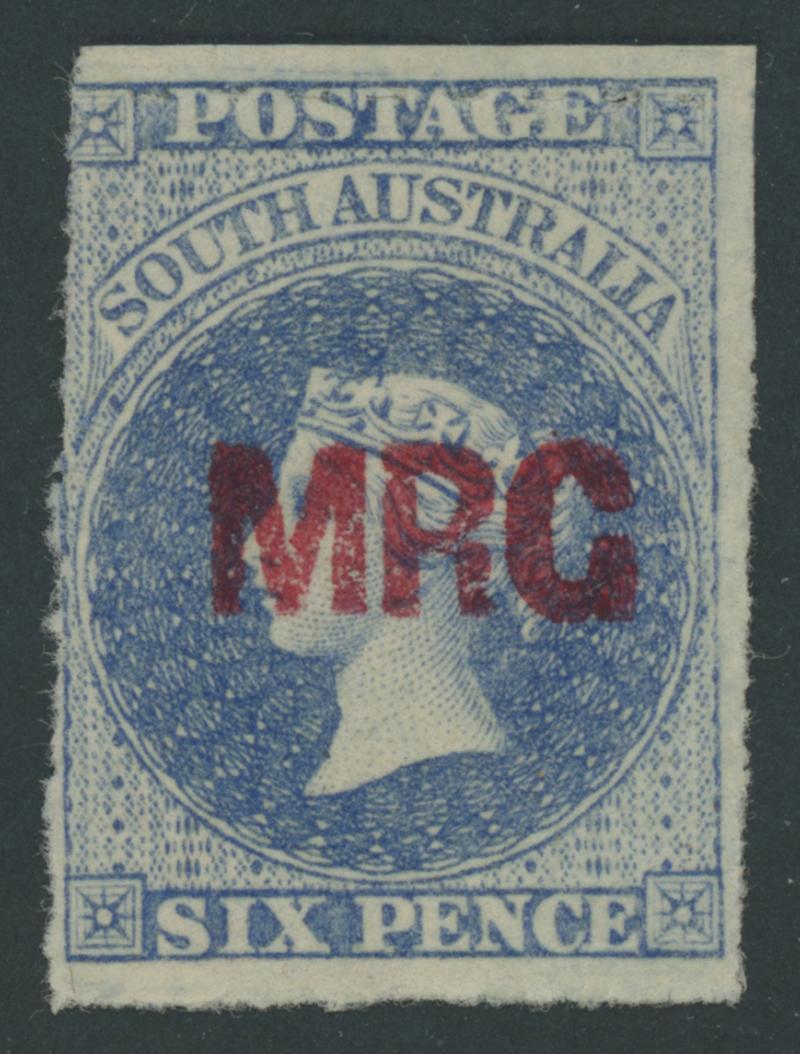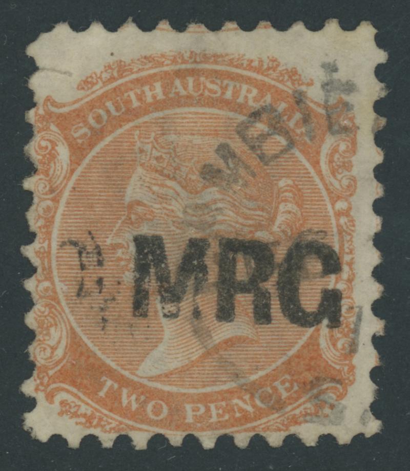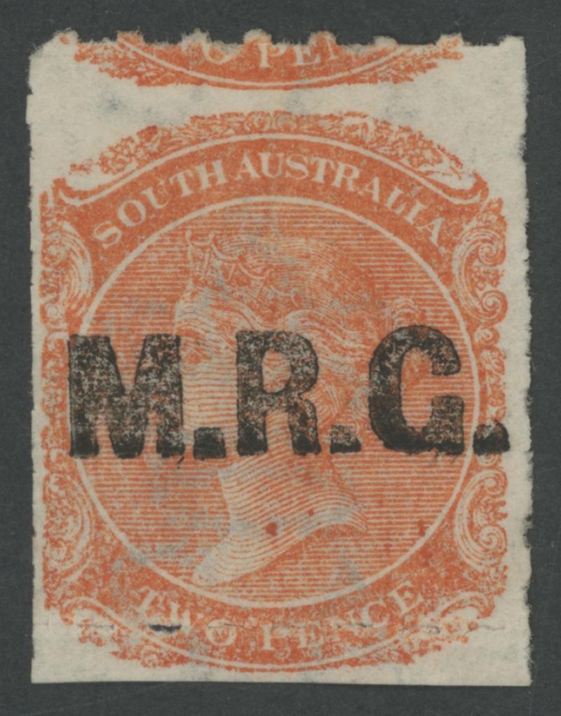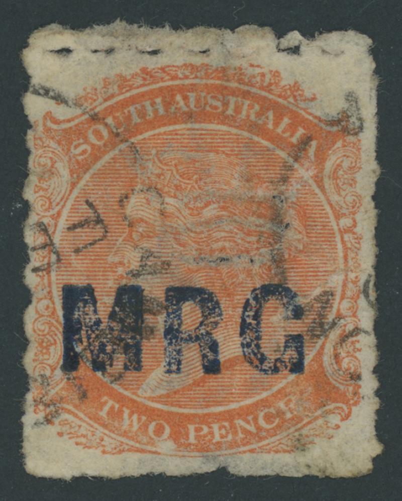 BLUE OVERPRINT: 'MRG' (No Stops) on QV De La Rue Crown/SA Wmk Rouletted 2d orange SG DO372, rouletting on all sides & apparently with Double Roulettes at the Top, a couple of tiny imperfections, part Gambierton cds, Cat £1800. Rated RRRR+. Ex Rev James Mursell, Colonel Napier - not included in his sales - and Don Pearce: sold for $2875 (Sale 247 Lot 465). Chris Ceremuga Certificate (2010) states "great rarity". (Image1)