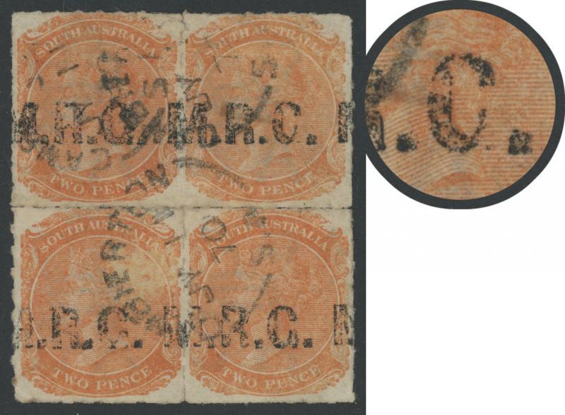 BLACK OVERPRINT: 'M.R.G.' on QV De La Rue Crown/SA Wmk Rouletted 2d red-orange SG DO373a block of 4, the upper-right unit with Defective 'G' appearing as a 'C', remarkably well-centred with rouletting on all sides & between the units, Gambierton cds of 'JY11/70', Cat £26,000+ for four singles. Rated RRRRR, but the error is the only recorded example so the block should be rated RRRRRR. Ex AE Fryar (1955) and Don Pearce: sold for $22,760 or only double what the 'Tamiami' single realised!