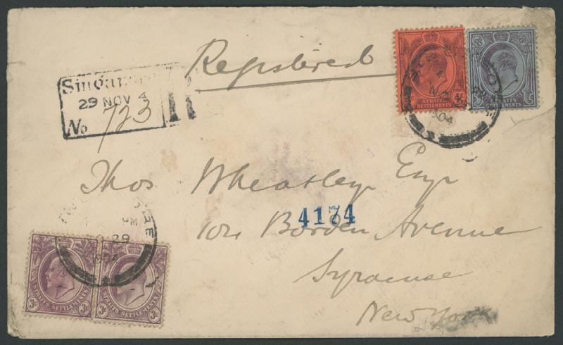 STRAITS SETTLEMENTS: 1904 (Nov 29) envelope registered to New York, USA with KEVII 3c violet x2, 4d purple/red & 8c purple/blue (minor crease) tied by Singapore cds cancels and 'SINGAPORE/R' boxed cachet at upper left, carried by ship via England with 'REGISTERED/LONDON/24DEC04' Hooded-Circle In red & New York '1-04/1905' oval transit backstamps, 'REGISTRY DIVISION/JAN 15 1905/SYRACUSE N.Y.' three-line arrival in violet on the reverse, a few blemishes & repaired edge faults. (Image1)