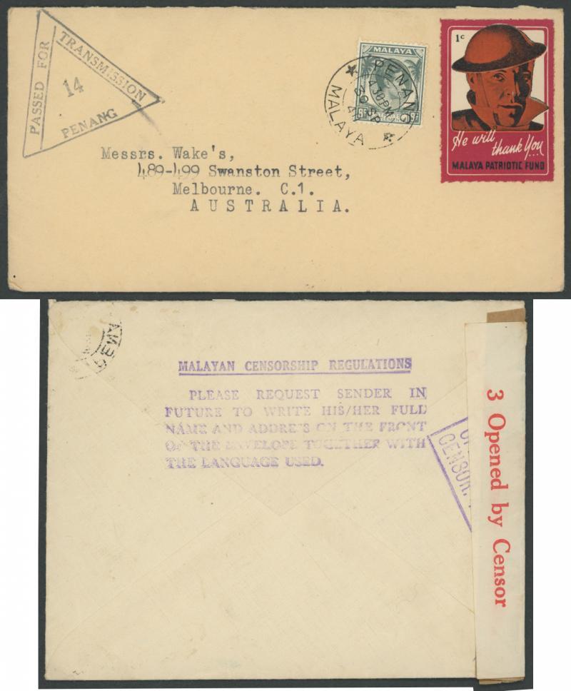 STRAITS SETTLEMENTS: 1940s surface & airmail envelopes to a mail order house in Melbourne mostly from Singapore plus a few from Penang & Perak, interest in the censor markings including a very fine strike of the 6-line 'MALAYAN CENSORSHIP REGULATIONS/...' (Morenweisrer #9; rated 10/10) on reverse of cover from Penang, three with Malaya Patriotic Fund labels comprising Small '2c', Medium '1c' (on the face) and Large '1c.' a few registered, Straits KGVI 2c green Postal Card with 2c green added endorsed "Air Mail" but probably not flown, several with 'BMA/MALAYA' frankings including two used in Perak, etc, condition variable. A new find, never before on the market.