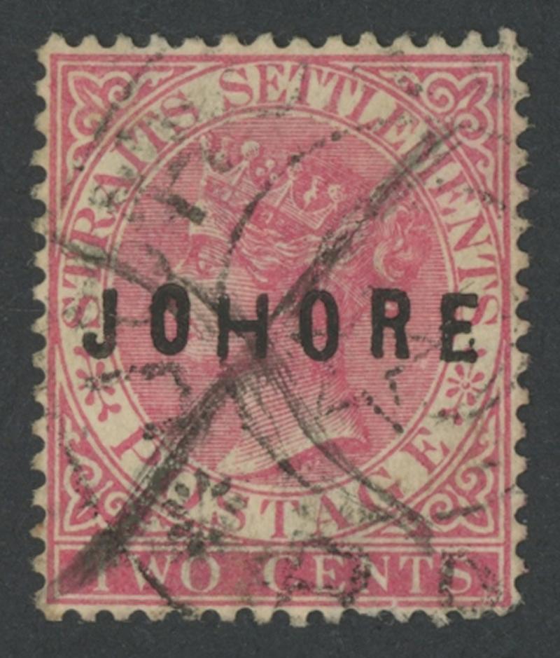 JOHORE: 1884-86 Overprints on Straits Settlements 'JOHORE' Type 4 on 2c pale rose SG 4, well-centred, manuscript "X" cancel in black ink overstruck by large-part light 'JOHORE/BA[HRU]' cds, a couple of slightly uneven perfs, Cat £1100. Chris Ceremuga Certificate (2024). (Image1)