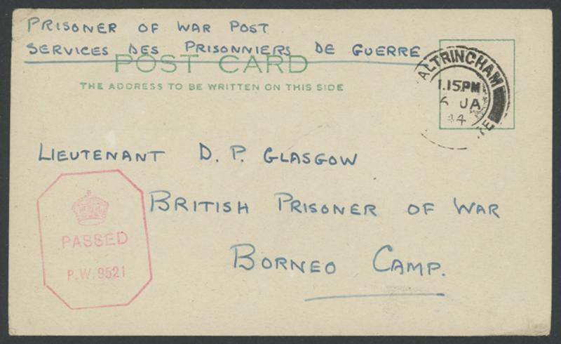 NORTH BORNEO: 1944 (Jan 6) Japanese Occupation Sandakan Prisoner of War Camp plain postcard with 'ALTRINCHAM' cds to "Borneo Camp" with British censor in rosine, the reverse with huge Japanese censor in violet & han of Kubo in scarlet, endorsed "Received 26th August 44", faint bends. (Image1)