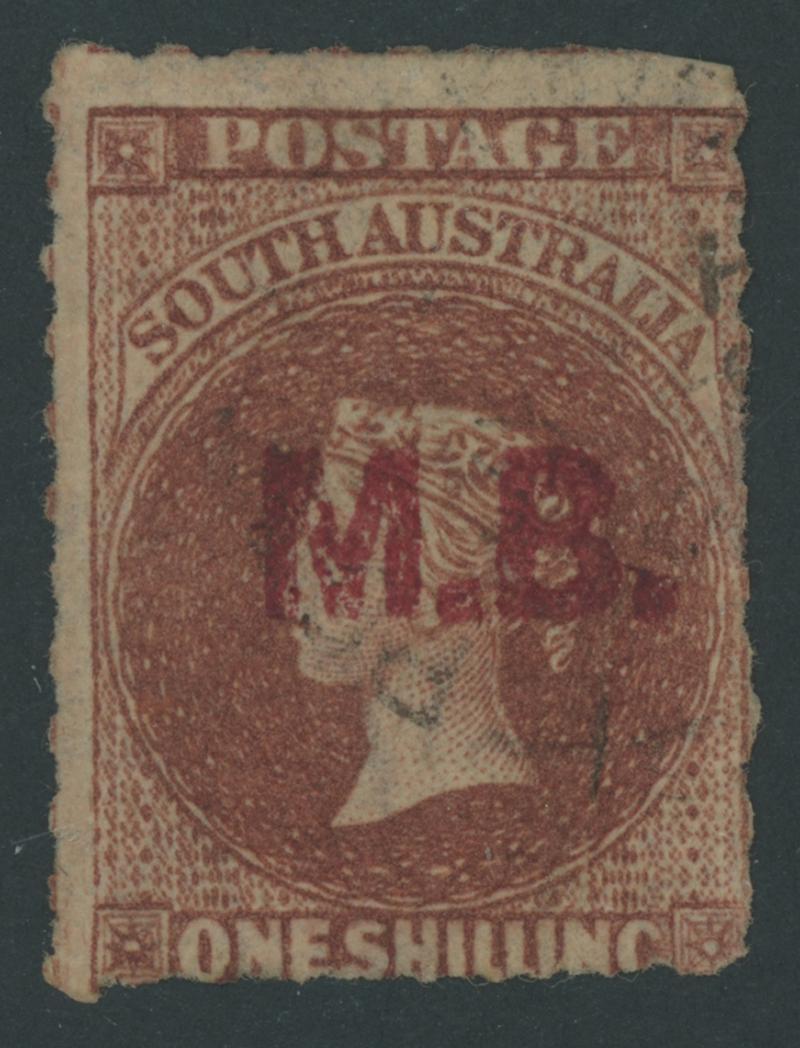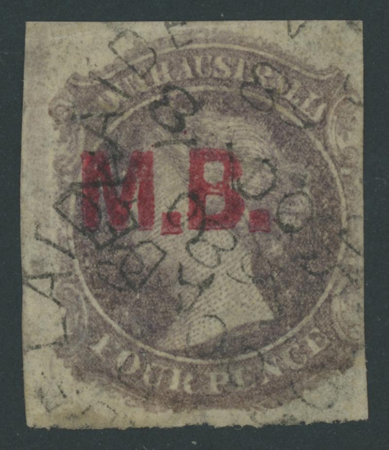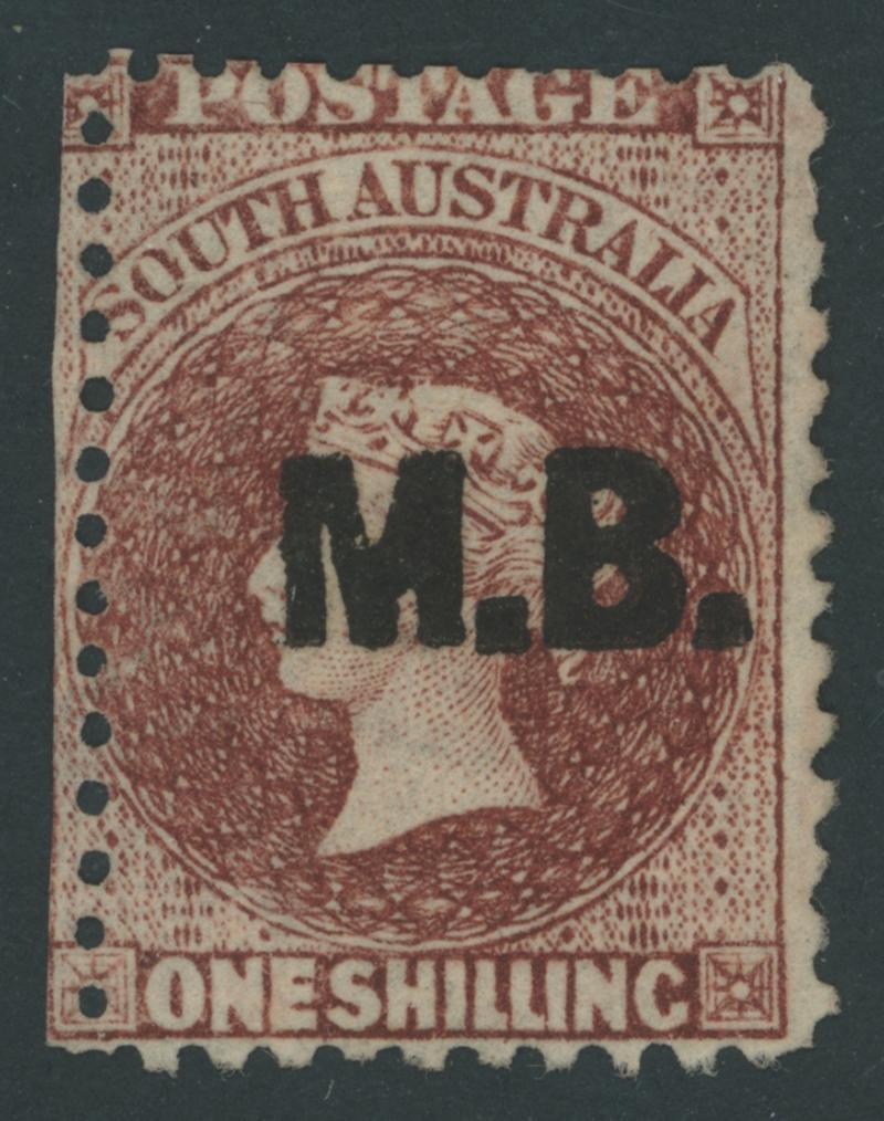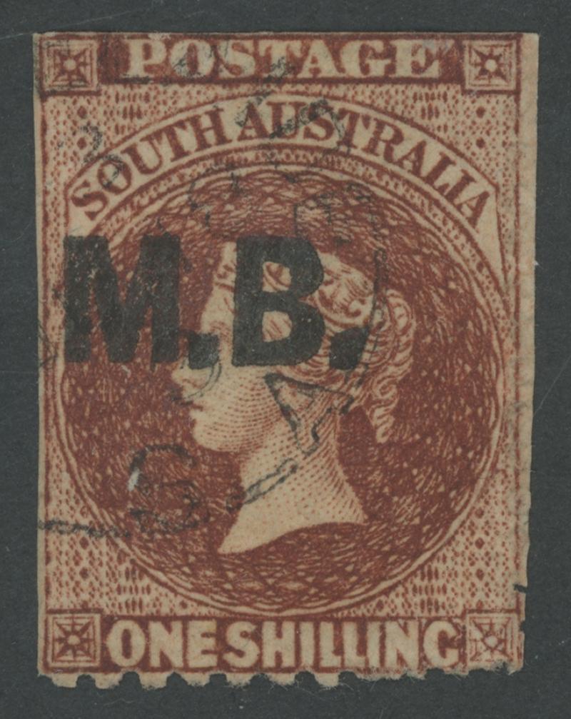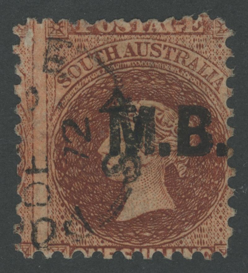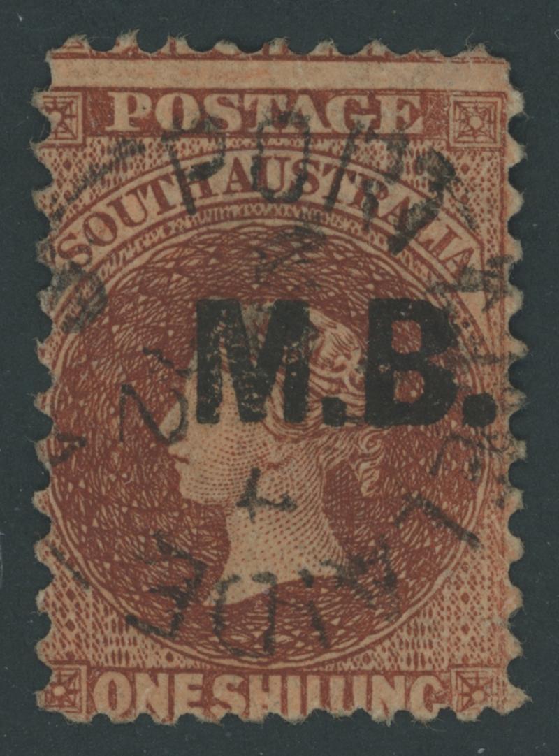 BLACK OVERPRINT: 'M.B.' on QV Perkins Bacon Large Star Wmk Perf 11½-12½ 1/- bright red-brown SG DO346, misplaced perforations resulting in 'POSTAGE' at the Base, Port Adelaide cds of 'JU21/69', Cat £200. Rated RRR. The very fine 'Besancon' and Don Pearce singles sold for SFr205 & $359 (Sale 247 Lot 519) respectively. [There seem to have been two distinct periods of use: 21.6.1869 to 1.12.1871 only, and 10.1.1874 to 20.5.1874 only] (Image1)