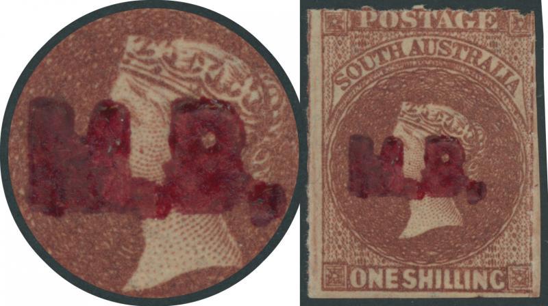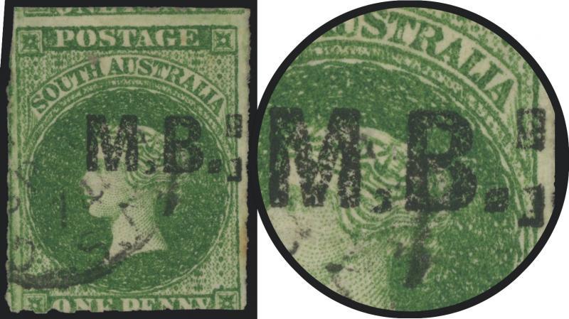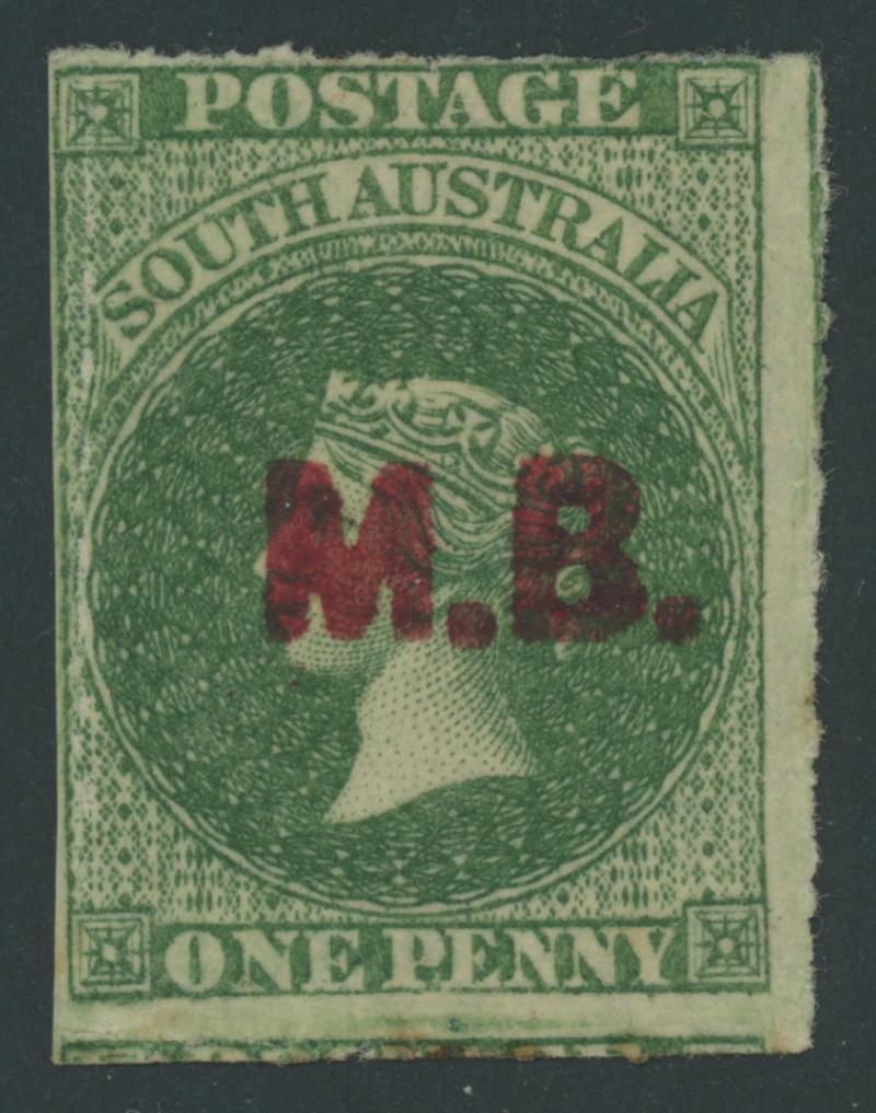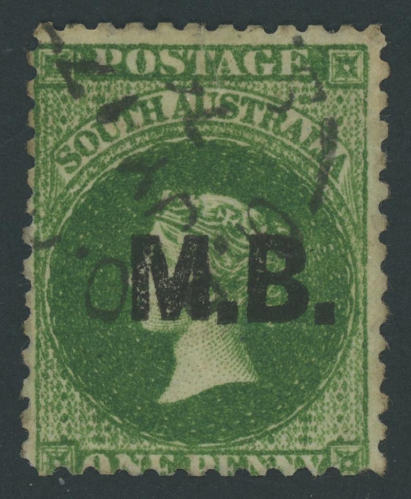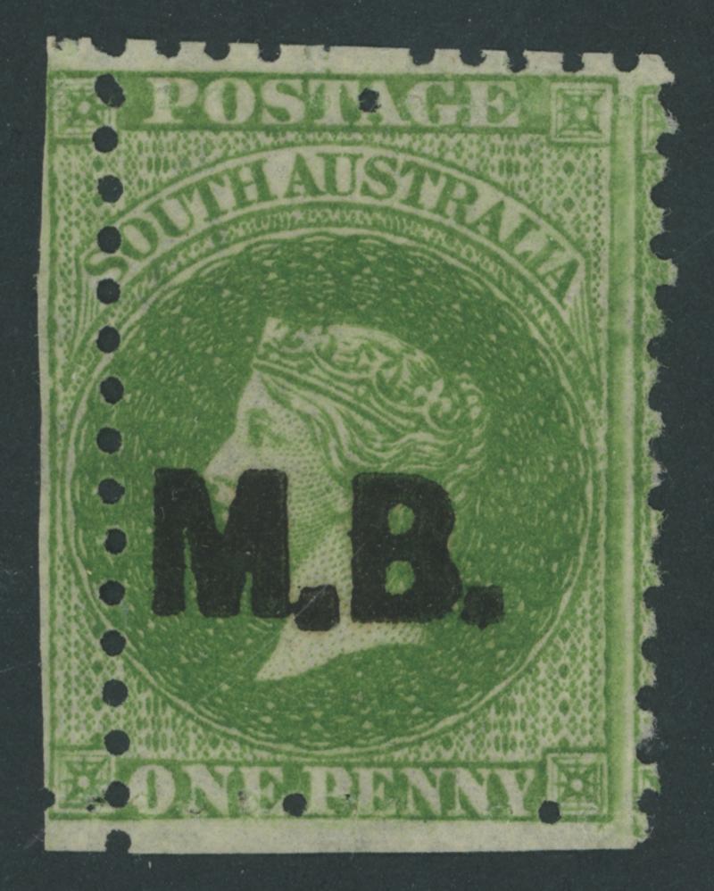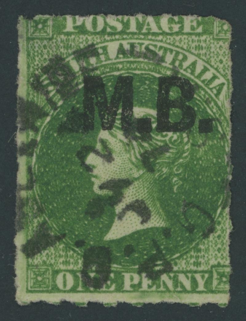 BLACK OVERPRINT: 'M.B.' on QV Perkins Bacon Large Star Wmk Perf 11½-12½ 1/- bright red-brown SG DO346, misplaced perforations resulting in 'POSTAGE' at the Base, Port Adelaide cds of 'JU21/69', Cat £200. Rated RRR. The very fine 'Besancon' and Don Pearce singles sold for SFr205 & $359 (Sale 247 Lot 519) respectively. [There seem to have been two distinct periods of use: 21.6.1869 to 1.12.1871 only, and 10.1.1874 to 20.5.1874 only] (Image1)