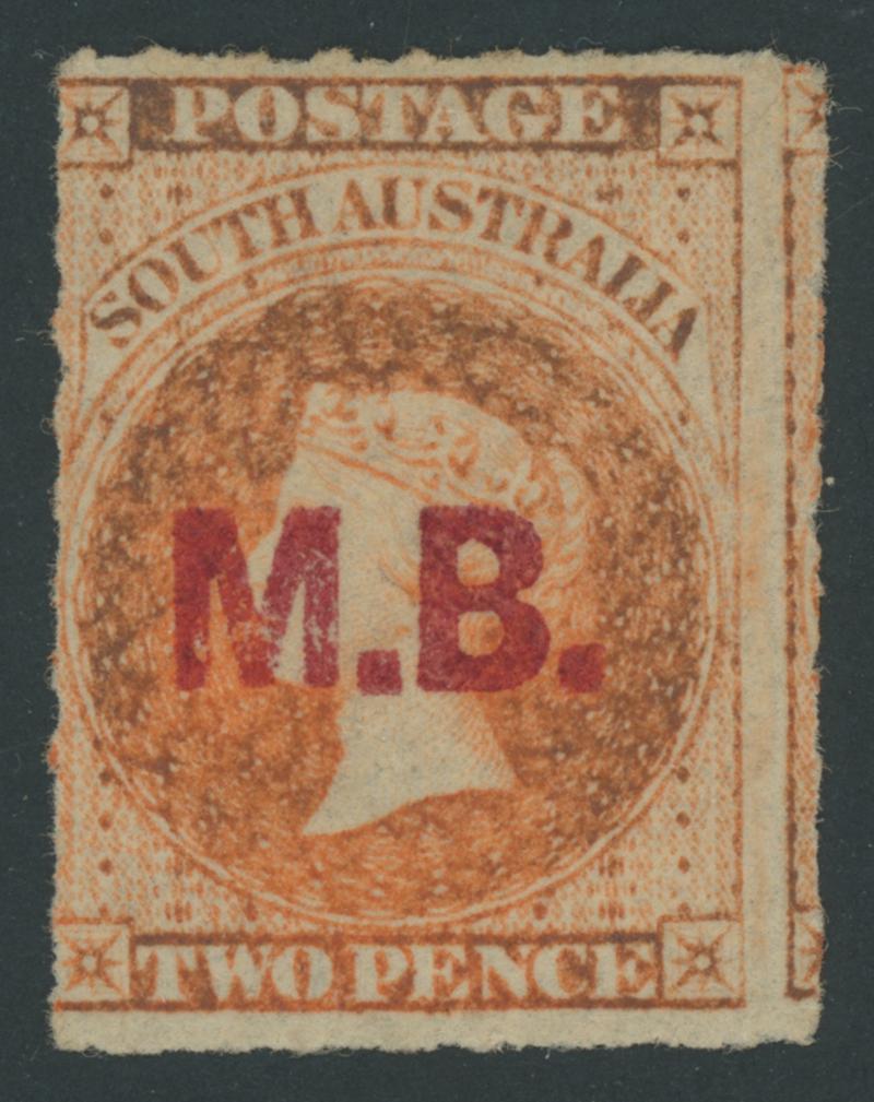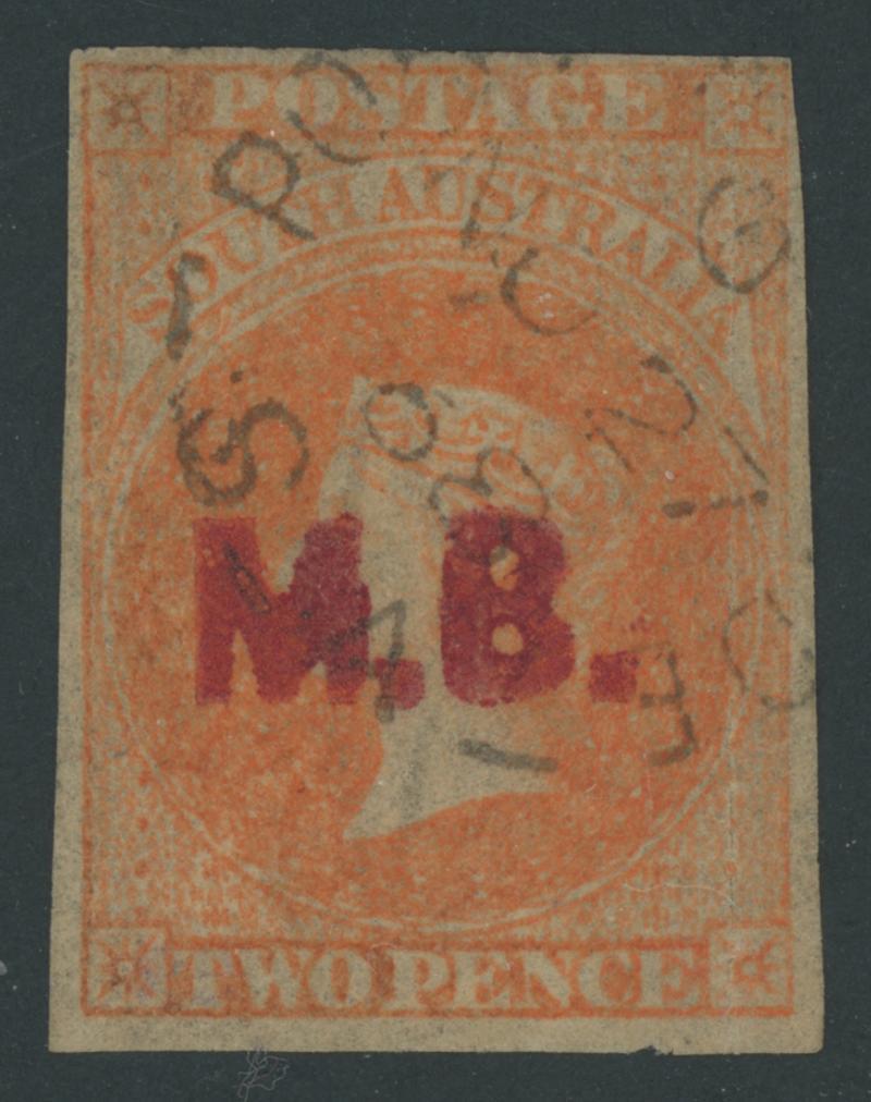 RED OVERPRINT: 'M.B.' on QV Perkins Bacon Large Star Wmk Rouletted 2d bright vermilion SG DO332, excellent colour, misplaced rouletting at right otherwise imperforate and cut from the sheet on all sides to preserve the design, Port Adelaide cds of 'NO27/68', Cat £450. Rated RRRR. Ex Victor Bullock: sold for $303. Chris Ceremuga Certificate (2019) states "extremely rare... superb". More attractive than Don Pearce's very fine example that sold for $745 (Sale 247 Lot 491). The 'Tamiami' example - "a little oxidised" -sold for $715 (Sale 236 Lot 649). Absent from 'Besancon'. [Date range 6.4.1868 to 27.11.1868] (Image1)