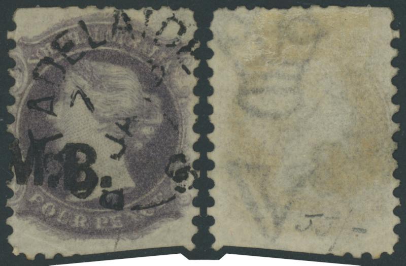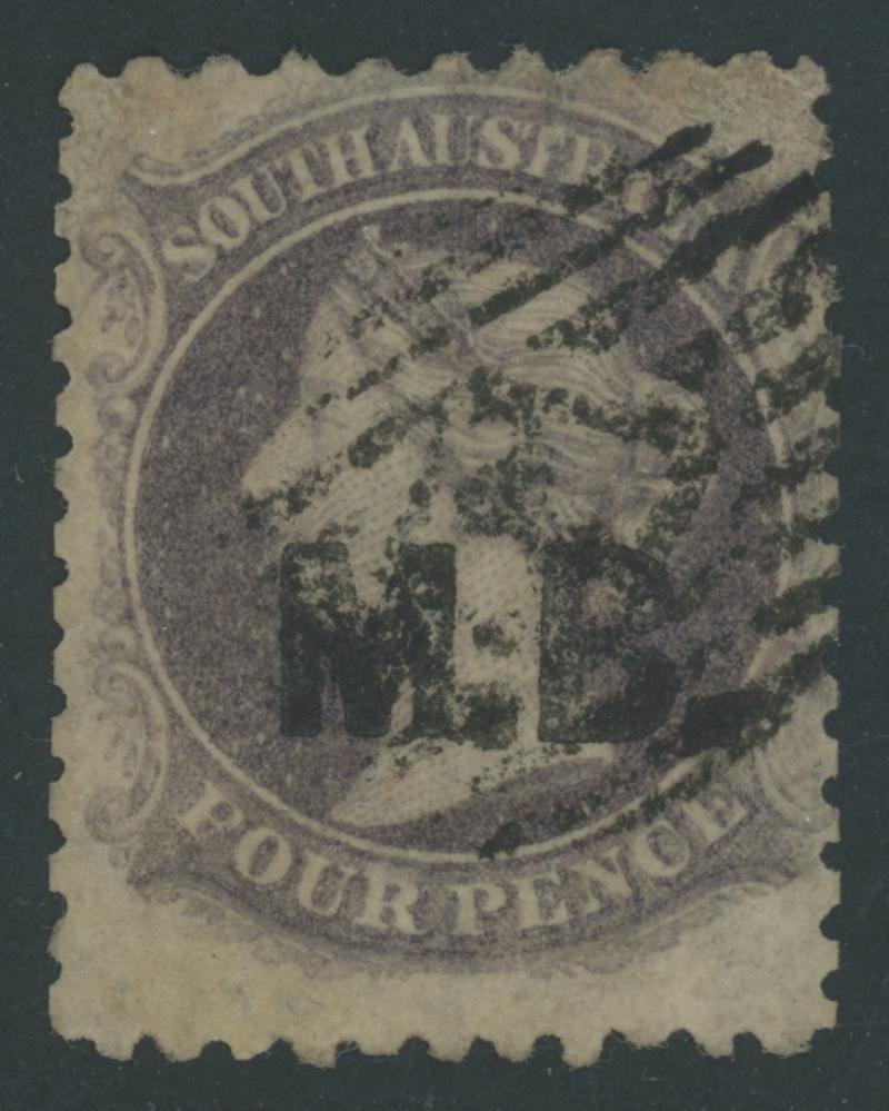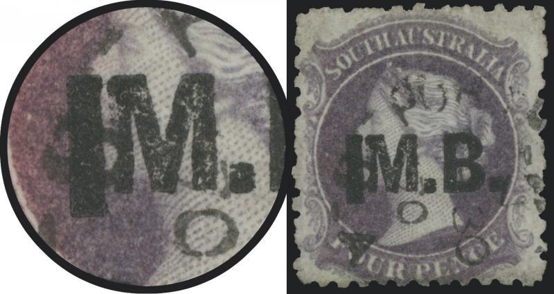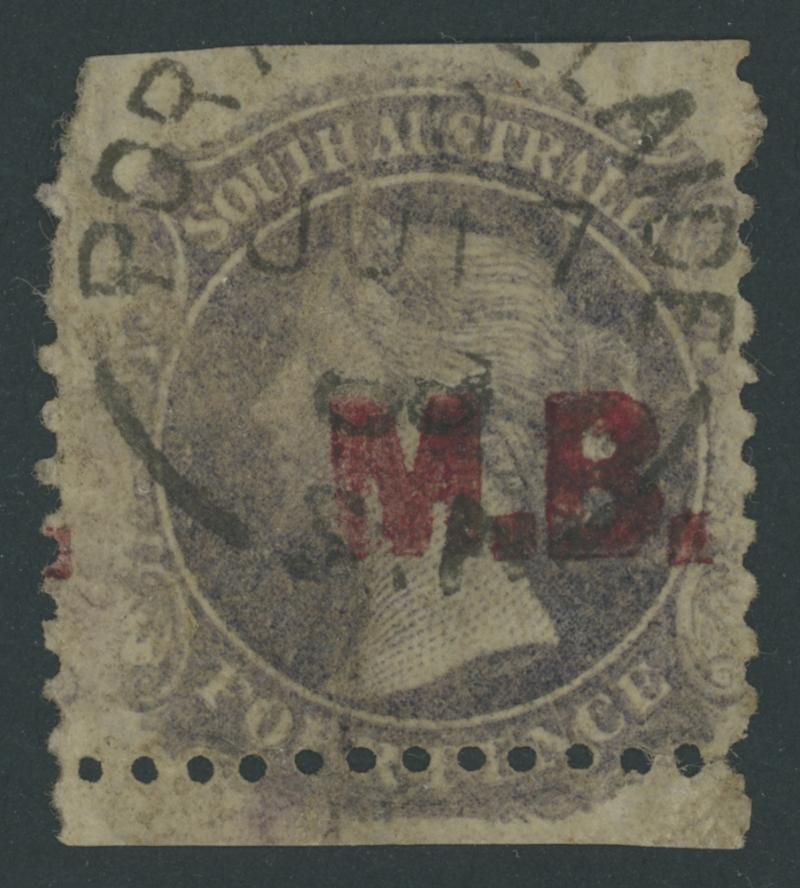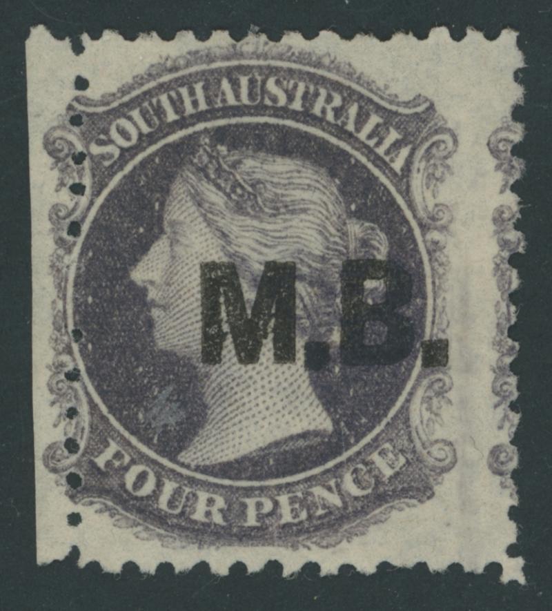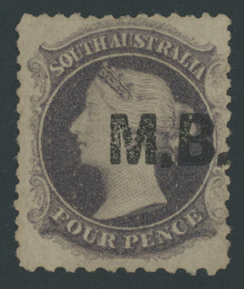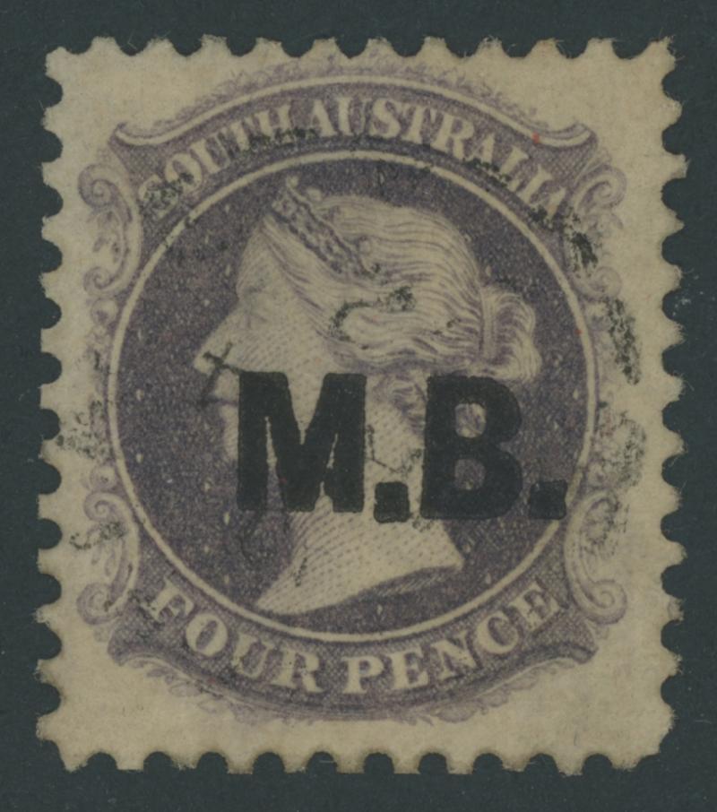 BLACK OVERPRINT: 'M.B.' on QV Perkins Bacon V/Crown Wmk Perf 10 4d deep purple SG DO347a, well-centred, some trimmed perfs at upper-left and at the base, Port Adelaide cds of 'JU18/71' (the only confirmed date), Cat £450. Rated RRRRR; unrecorded unused. Ex Don Pearce: sold for $685 (Sale 247 Lot 509). Absent from 'Besancon'. (Image1)